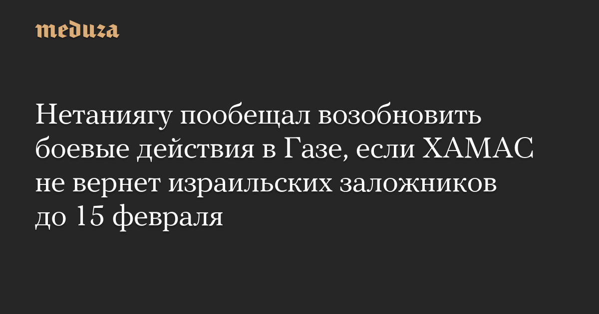 Израиль возобновит «интенсивные боевые действия» в секторе Газа, если группировка ХАМАС не освободит к полудню 15 февраля израильских заложников, заявил премьер-министр страны Биньямин Нетаниягу после совещания военно-политического кабинета.