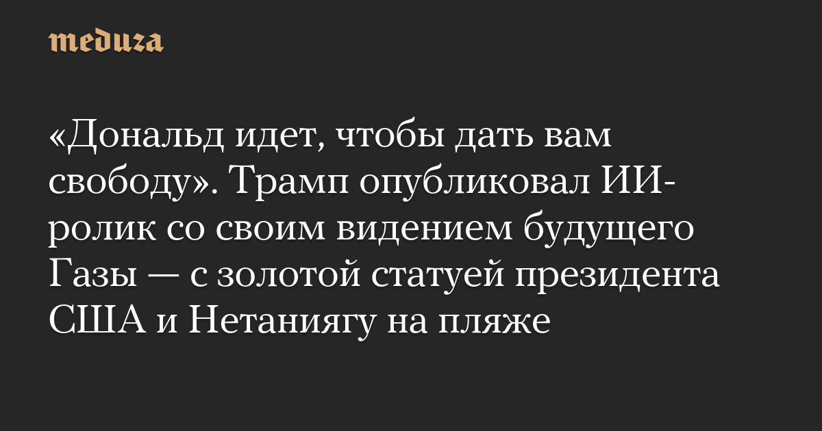 «Дональд идет, чтобы дать вам свободу». Трамп опубликовал ИИ-ролик со своим видением будущего Газы — с золотой статуей президента США и Нетаниягу на пляже