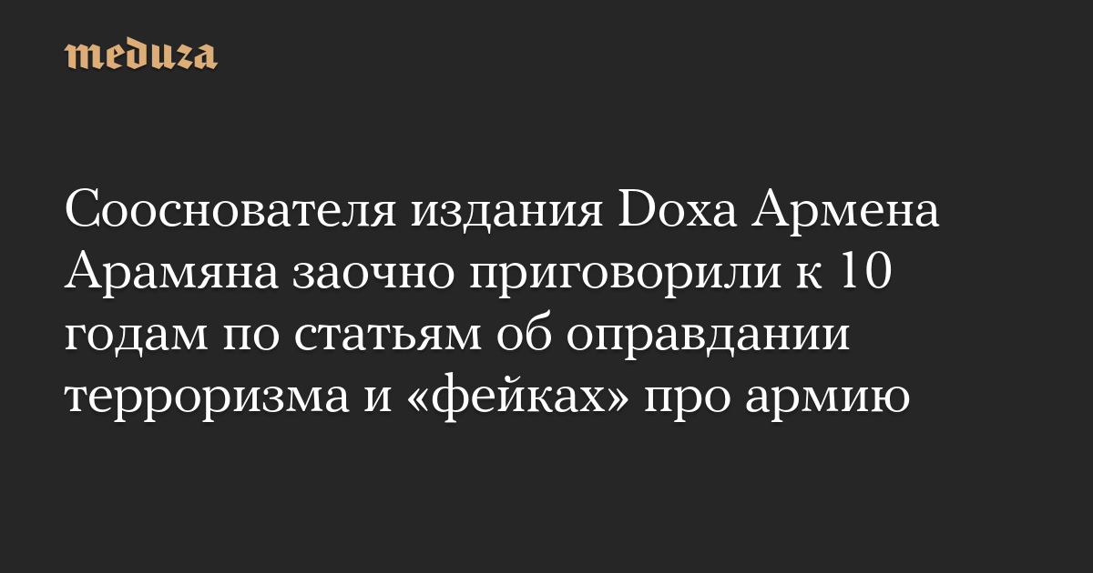 Сооснователя издания Doxa Армена Арамяна заочно приговорили к 10 годам по статьям об оправдании терроризма и «фейках» про армию