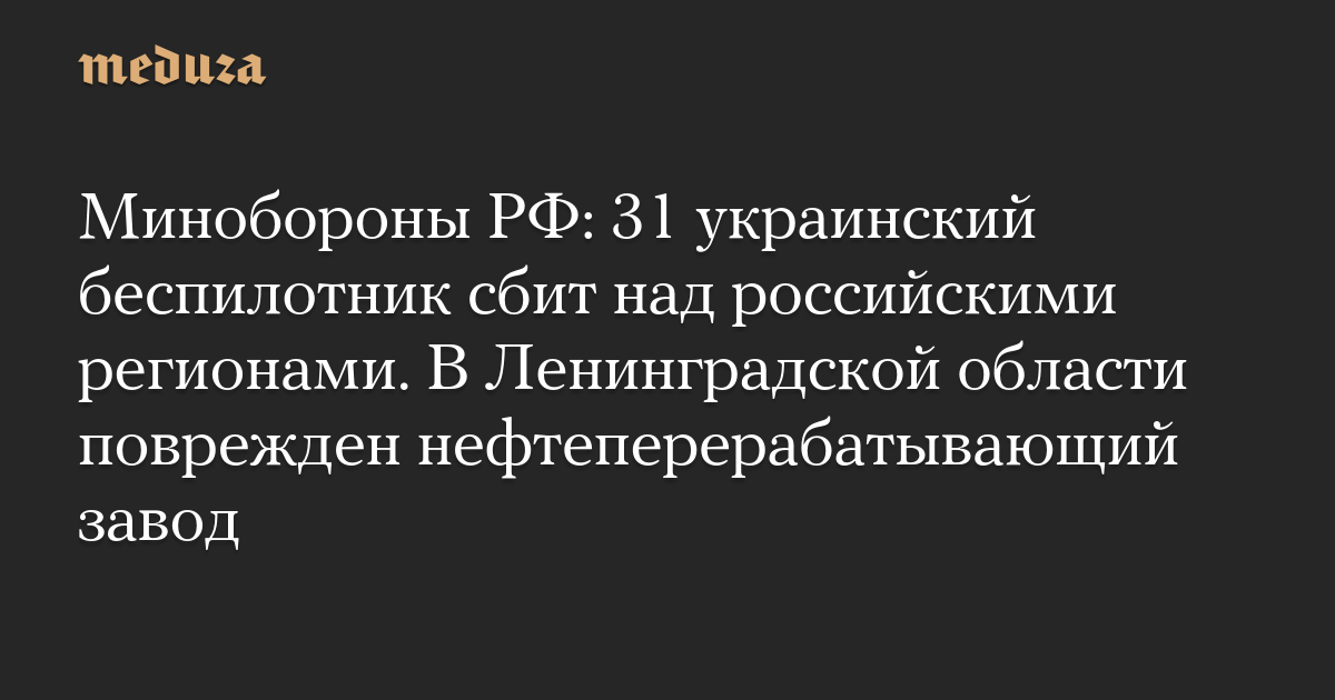 Минобороны РФ: 31 украинский беспилотник сбит над российскими регионами. В Ленинградской области поврежден нефтеперерабатывающий завод