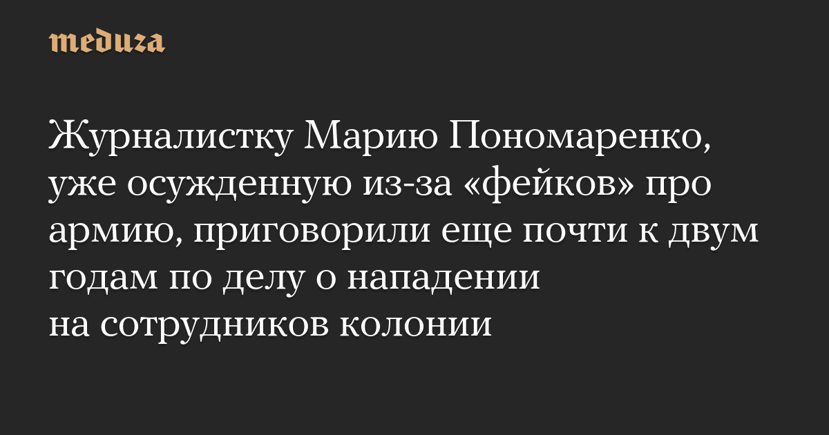 По первому делу о распространении «фейков» Пономаренко задержали еще в апреле 2022 года. После приговора, вынесенного в феврале 2023-го, ее отправили в колонию. В ноябре этого же года стало известно, что Пономаренко обвиняют в нападении на двух сотрудников колонии (часть 2 статьи 321 УК). По официальной версии, журналистка, находясь в ИК-6 Шипуново Алтайского края, отказалась идти на дисциплинарную комиссию, в результате чего сотрудники колонии повели ее туда силой, а она напала на них. Сама Пономаренко отрицает эти обвинения.