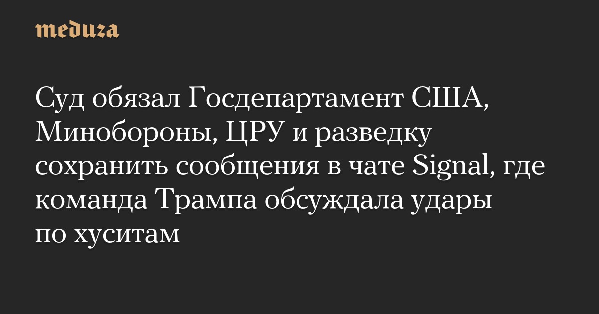 Суд обязал Госдепартамент США, Минобороны, ЦРУ и разведку сохранить сообщения в чате Signal, где команда Трампа обсуждала удары по хуситам