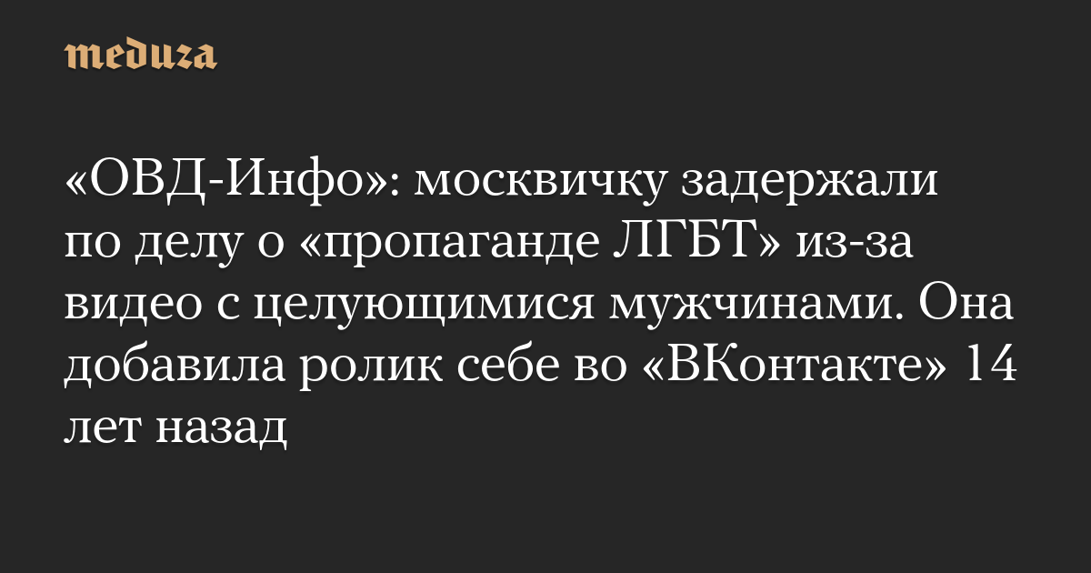«ОВД-Инфо»: москвичку задержали по делу о «пропаганде ЛГБТ» из-за видео с целующимися мужчинами. Она добавила ролик себе во «ВКонтакте» 14 лет назад