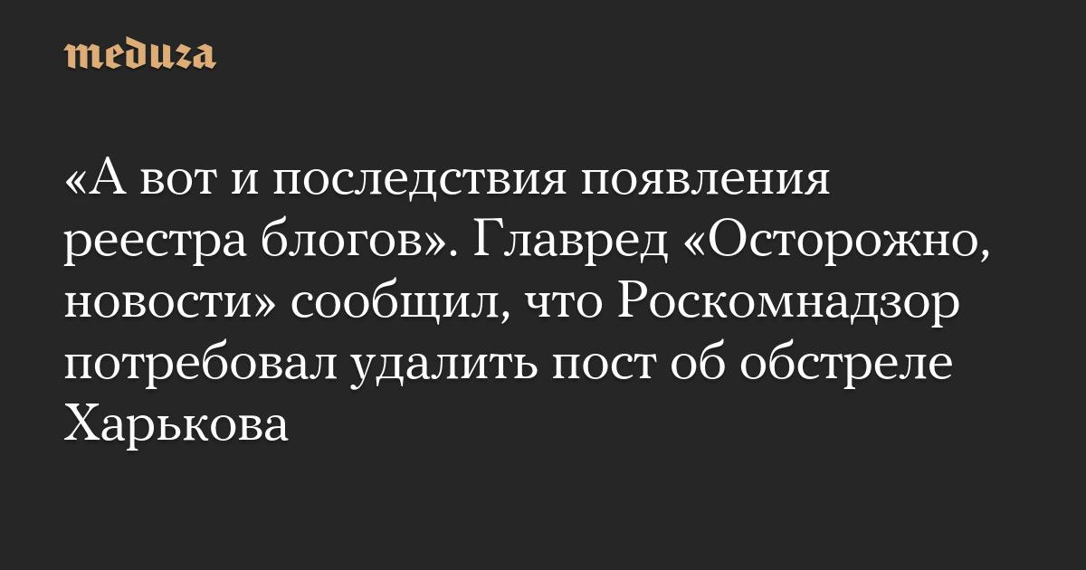 «А вот и последствия появления реестра блогов». Главред «Осторожно, новости» сообщил, что Роскомнадзор потребовал удалить пост об обстреле Харькова