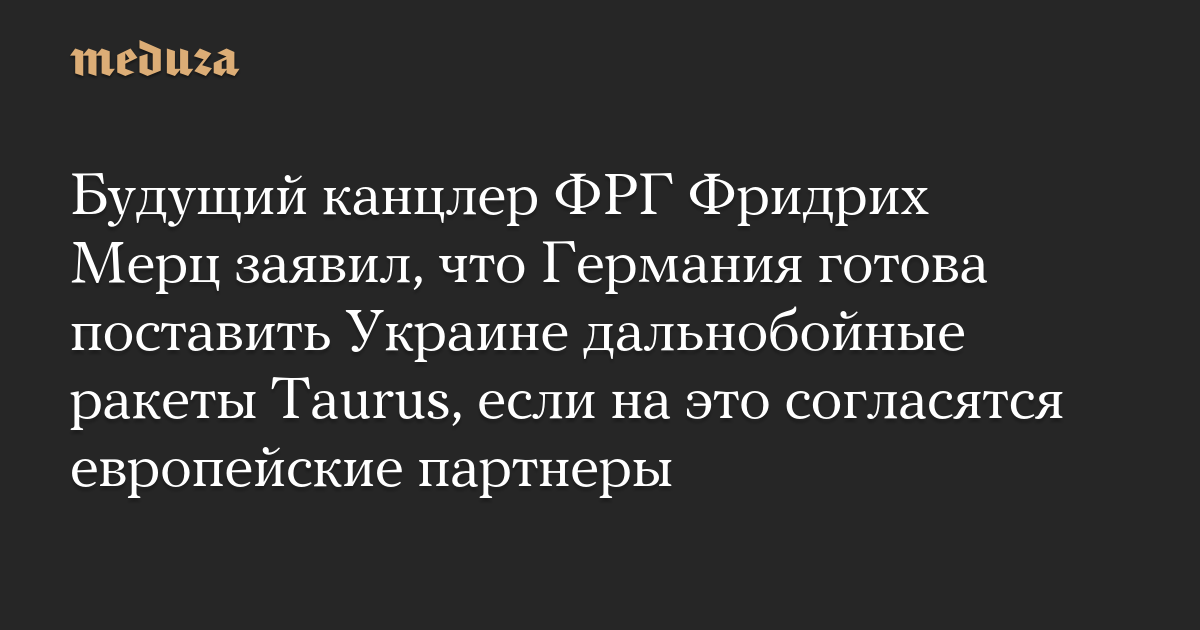 Будущий канцлер ФРГ Фридрих Мерц заявил, что Германия готова поставить Украине дальнобойные ракеты Taurus, если на это согласятся европейские партнеры