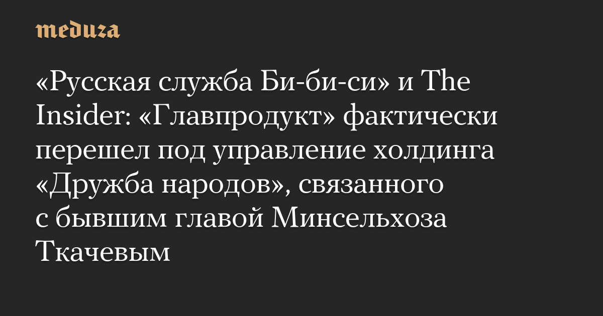 «Русская служба Би-би-си» и The Insider: «Главпродукт» фактически перешел под управление холдинга «Дружба народов», связанного с бывшим главой Минсельхоза Ткачевым