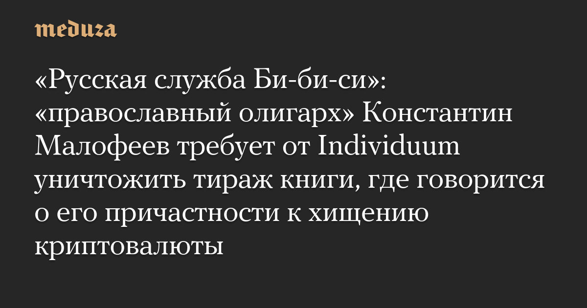 «Русская служба Би-би-си»: «православный олигарх» Константин Малофеев требует от Individuum уничтожить тираж книги, где говорится о его причастности к хищению криптовалюты