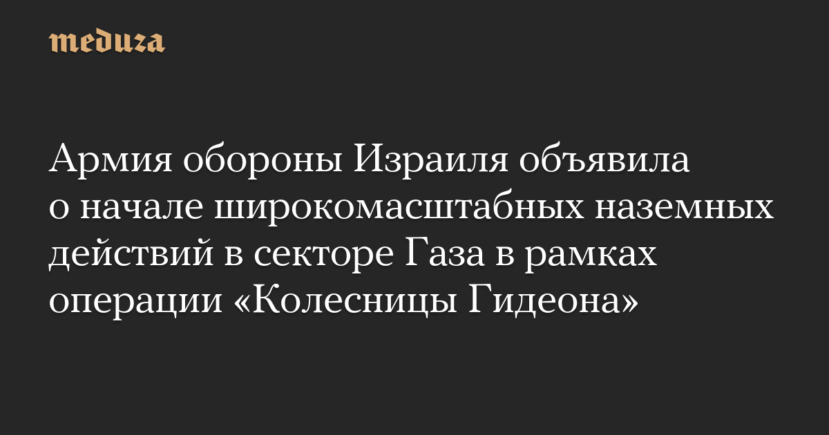Армия обороны Израиля объявила о начале «широкомасштабных наземных действий» на севере и юге сектора Газа в рамках операции «Колесницы Гидеона», сообщили в пресс-службе ЦАХАЛ.
