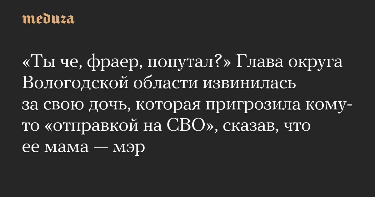 «Ты че, фраер, попутал?» Глава округа Вологодской области извинилась за свою дочь, которая пригрозила кому-то «отправкой на СВО», сказав, что ее мама — мэр