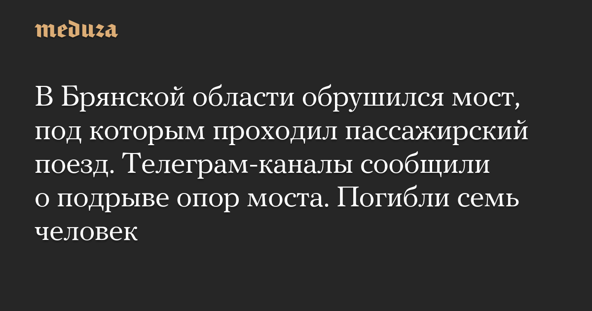 Обновление. В 02:45 губернатор Брянской области Александр Богомаз сообщил, что в результате обрушения моста на поезд погибли семь человек. «В медорганизации Брянской области доставлены 30 пострадавших, в том числе 2 детей. Двое из пострадавших, в том числе ребенок, в тяжелом состоянии», — заявил губернатор.