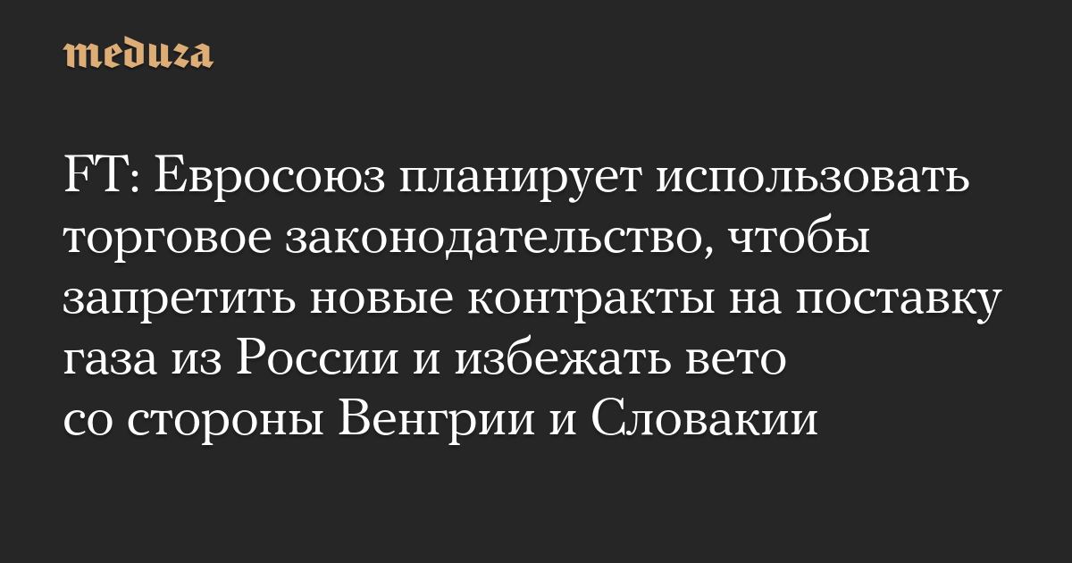 Запрет на заключение новых контрактов на основании торгового законодательства, отмечает FT, позволит избежать вето со стороны Венгрии и Словакии, которое эти страны могли бы наложить, если бы речь шла о санкциях, требующих единогласной поддержки всех стран-членов Евросоюза.