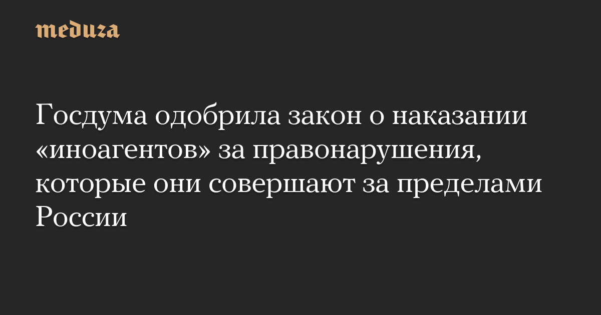 Депутаты Госдумы РФ приняли в третьем, окончательном чтении закон, который разрешит наказывать «иностранных агентов» за административные правонарушения, которые они, по мнению властей России, совершили за пределами страны.