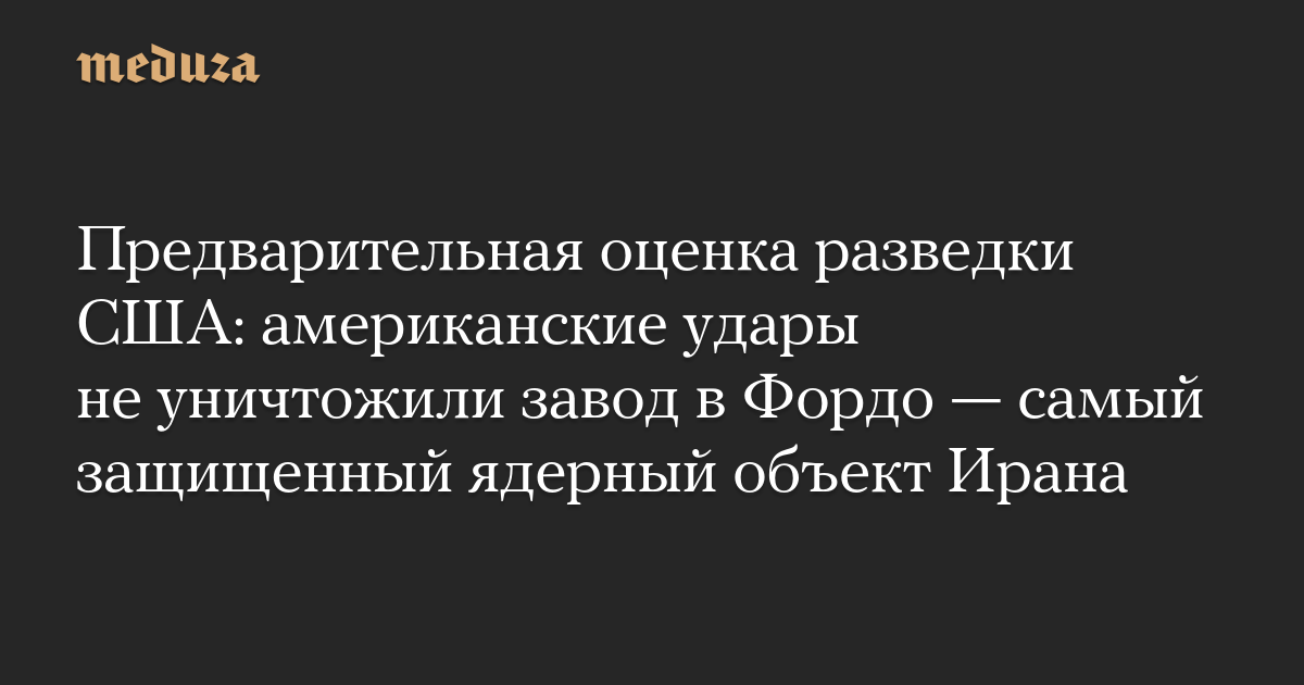 Выводы разведки показывают, что заявления Трампа о том, что ядерные объекты Ирана были уничтожены, — преувеличение. По крайней мере, об этом говорят первоначальные оценки ущерба, отмечает The New York Times. Власти США собирались отчитаться перед конгрессом о результатах американских ударов 24 июня, но в итоге заседание перенесли на 26-е.