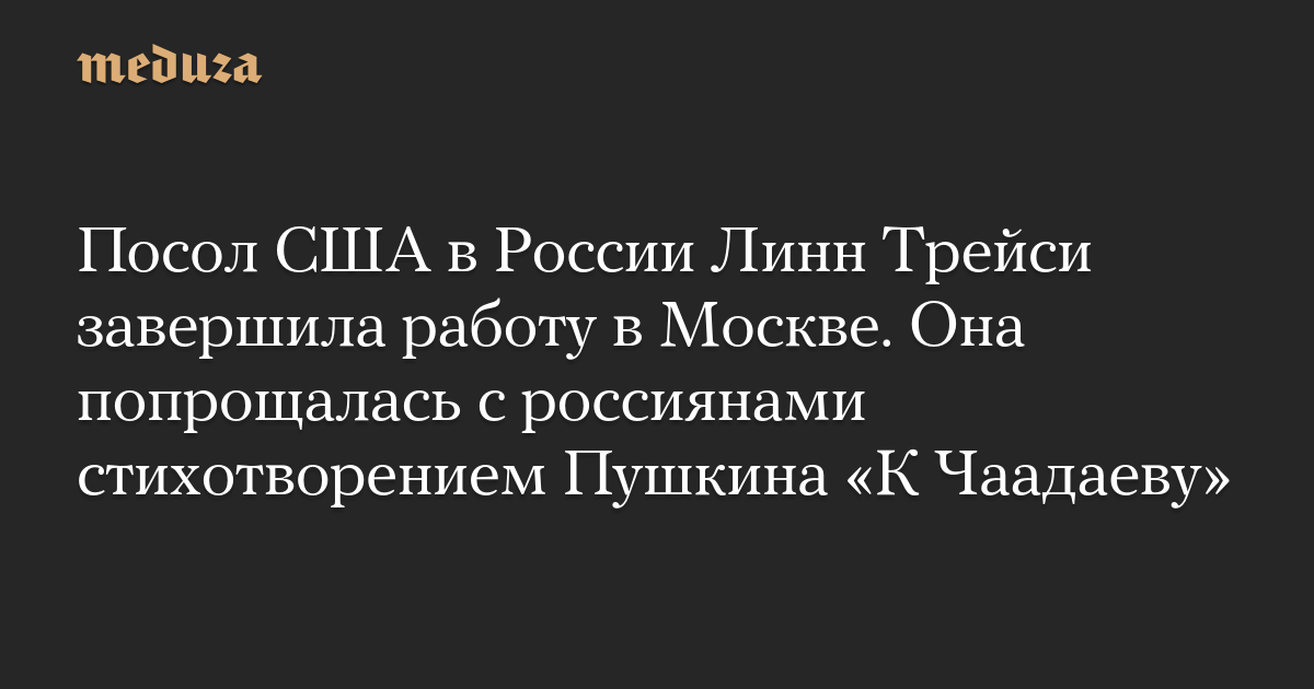 Посол США в России Линн Трейси завершила работу в Москве. Она попрощалась с россиянами стихотворением Пушкина «К Чаадаеву»
