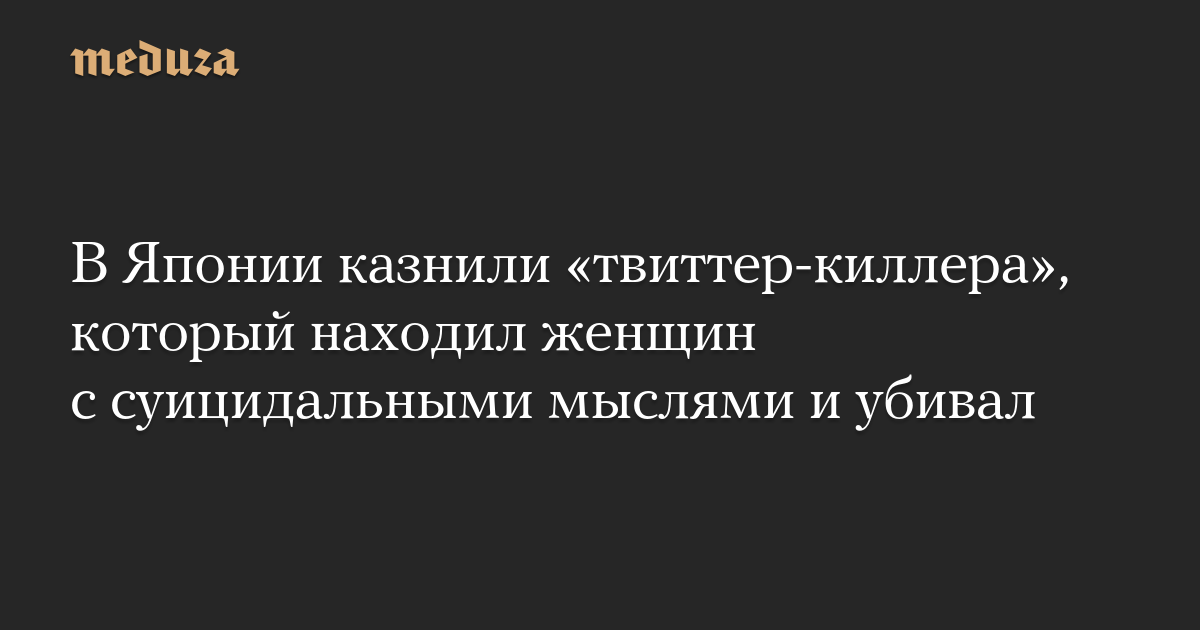 В Японии казнили 34-летнего Такахиро Сираиси, известного как «твиттер-киллер», сообщила японская телерадиокомпания NHK. В 2020 году его признали виновным в убийстве женщин, делившихся суицидальными мыслями в твиттере. Это первый случай применения смертной казни в стране с 2022 года.