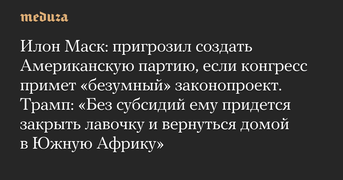 Илон Маск: пригрозил создать Американскую партию, если конгресс примет «безумный» законопроект. Трамп: «Без субсидий ему придется закрыть лавочку и вернуться домой в Южную Африку»