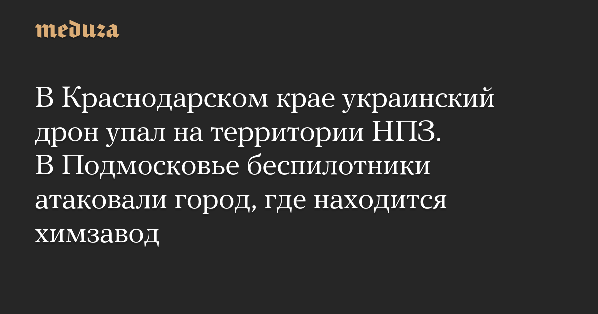 В Краснодарском крае украинский дрон упал на территории НПЗ. В Подмосковье беспилотники атаковали город, где находится химзавод