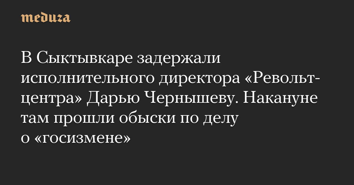 Исполнительный директор культурного пространства «Револьт-центр» и бывший менеджер издания «7×7» Дарья Чернышева задержана в Сыктывкаре по обвинению в уклонении от исполнения обязанностей «иноагента» (часть 1 статьи 330.1 УК, наказывается лишением свободы на срок до двух лет). Об этом сообщает издание «Вот так», ссылаясь на источник, знакомый с ходом процесса.