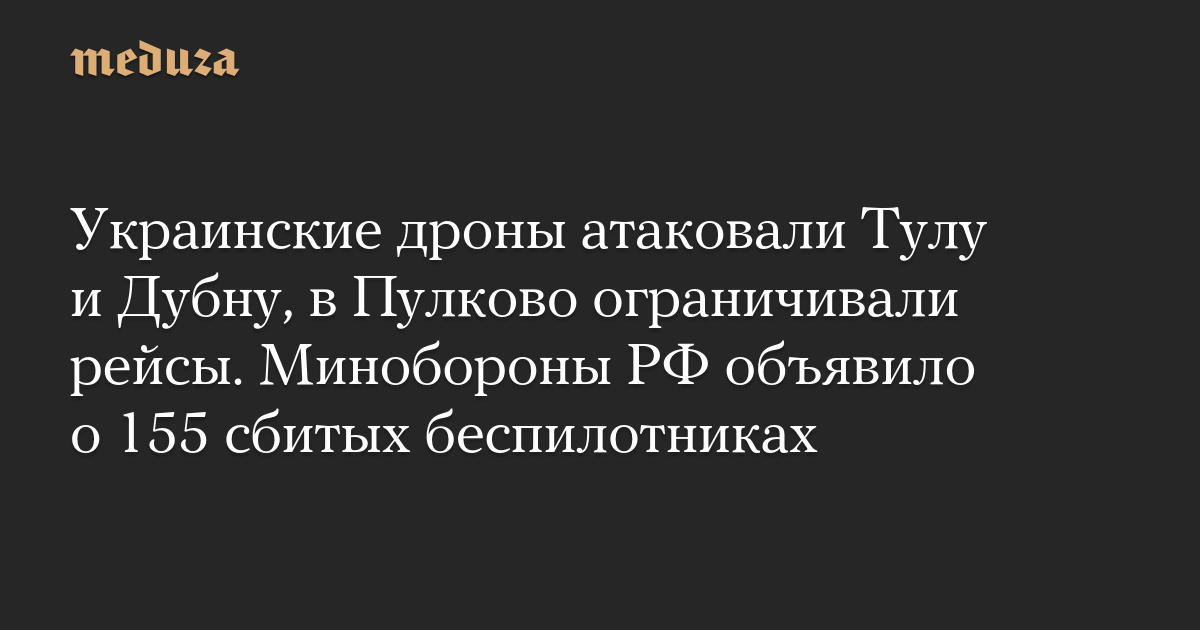 Украинские дроны атаковали Тулу и Дубну, в Пулково ограничивали рейсы. Минобороны РФ объявило о 155 сбитых беспилотниках