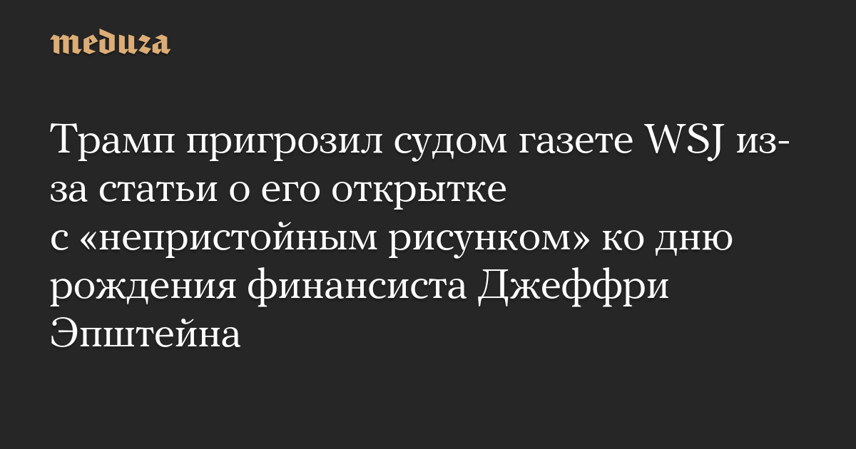 «The Wall Street Journal опубликовала ФЕЙКОВОЕ письмо, якобы адресованное [Джеффри] Эпштейну. Это не мои слова, не мой стиль речи. К тому же, я не рисую. Это не мои слова, я так не говорю. И я не рисую картинки. Я сказал Руперту Мердоку (американский медиамагнат и владелец газеты — прим. „Медузы“), что это афера, и что он не должен печатать эту поддельную историю. Но он все равно напечатал, и теперь я собираюсь засудить его вместе с его третьесортной газетой», — написал Трамп в соцсети Truth Social.