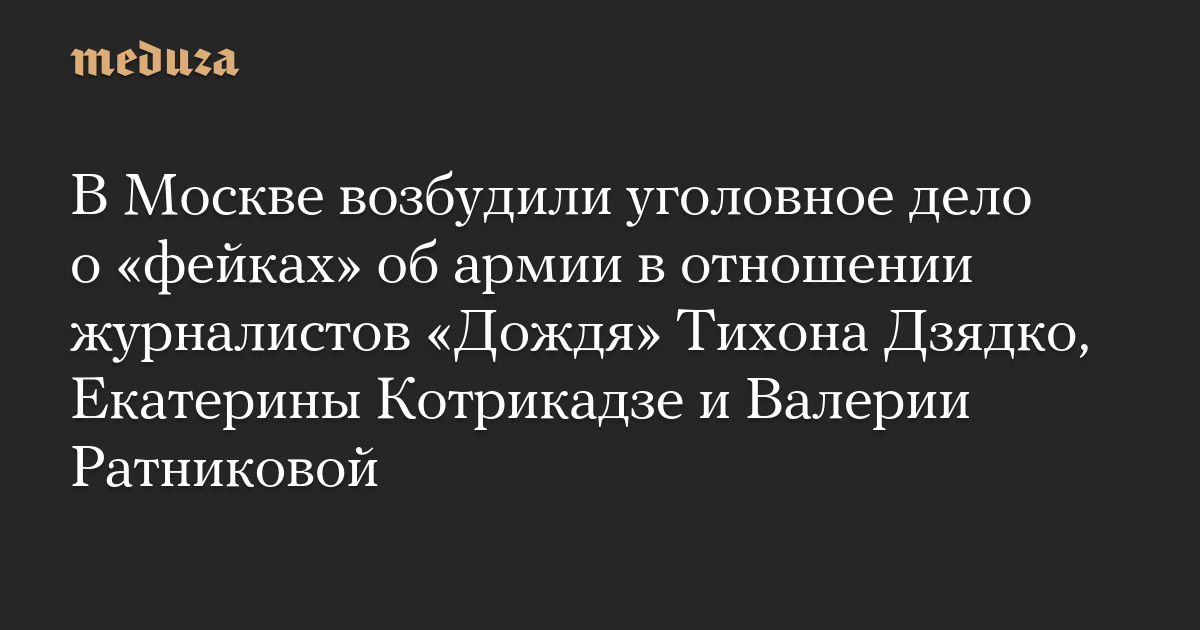 В Москве возбудили уголовное дело о «фейках» об армии в отношении журналистов «Дождя» Тихона Дзядко, Екатерины Котрикадзе и Валерии Ратниковой