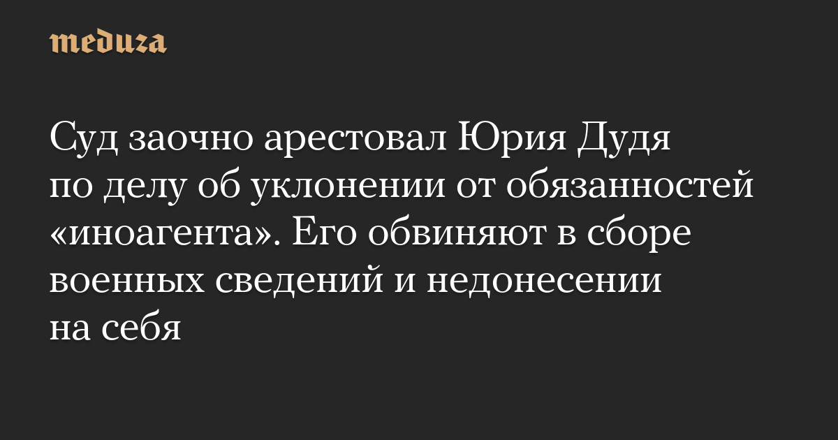 Суд заочно арестовал Юрия Дудя по делу об уклонении от обязанностей «иноагента». Его обвиняют в сборе военных сведений и недонесении на себя
