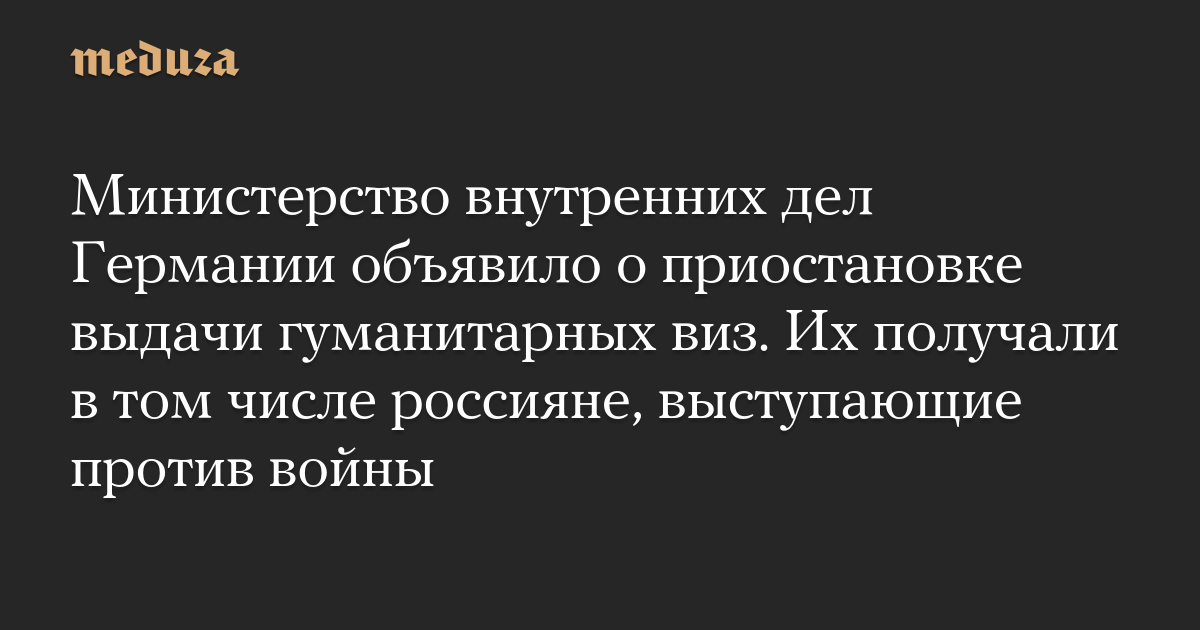 Федеральное министерство внутренних дел Германии (BMI) приостановило выдачу гуманитарных виз, сообщается на сайте ведомства. На это сообщение обратил внимание правозащитный проект «Ковчег».