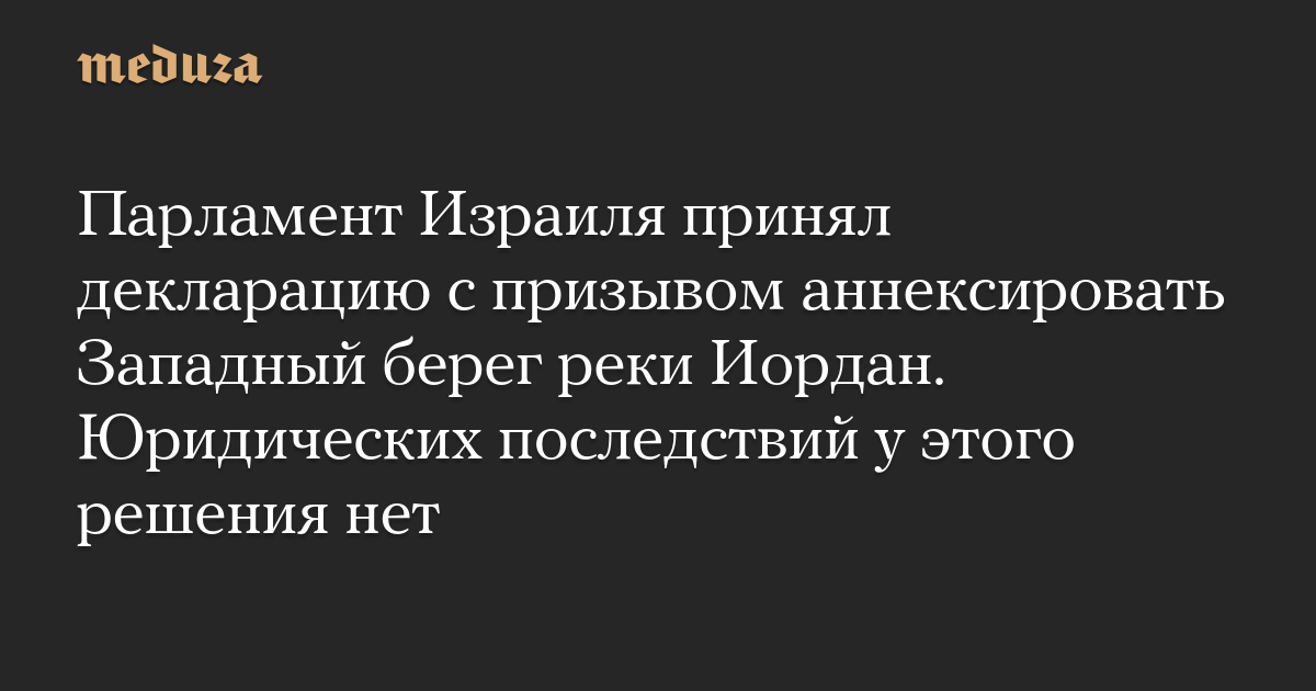 Парламент Израиля принял декларацию с призывом аннексировать Западный берег реки Иордан. Юридических последствий у этого решения нет