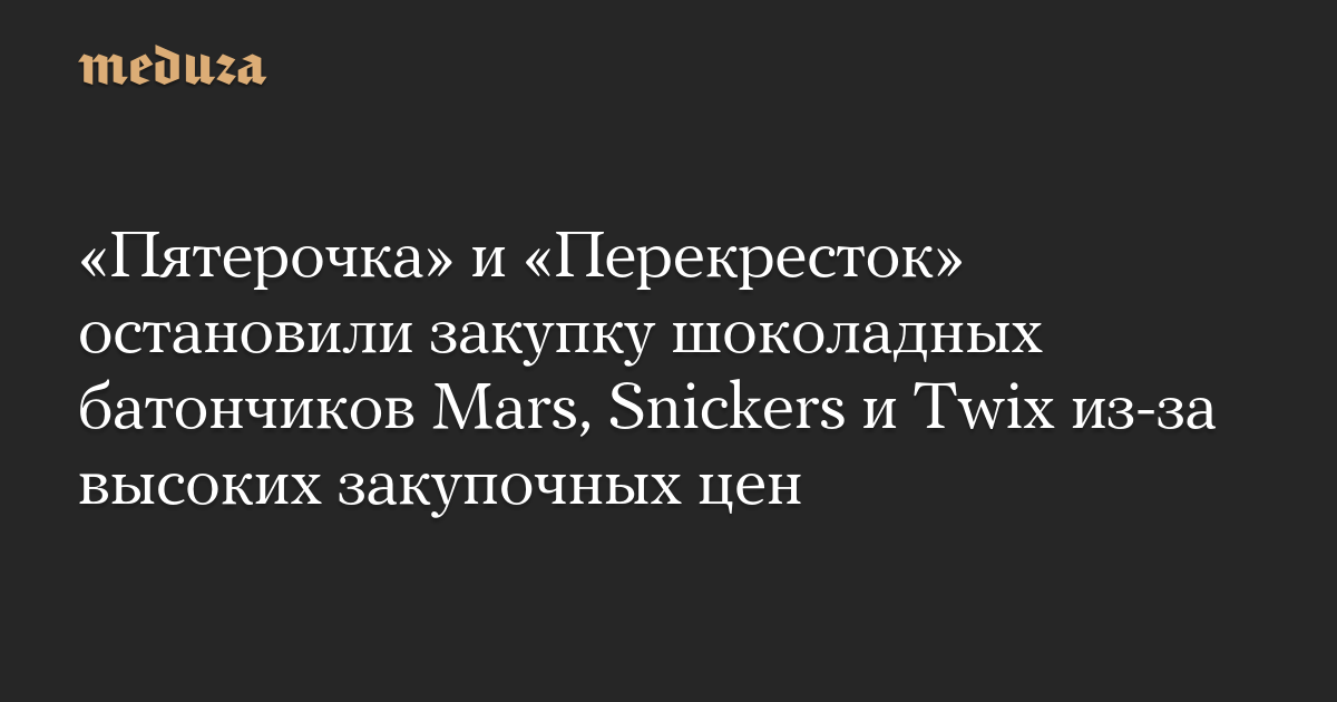 Магазины «Пятерочка» и «Перекресток» приостановили закупку шоколадных батончиков Mars, Snickers и Twix, а также драже M&Ms и Skittles и жевательных резинок Orbit, сообщают «Ведомости», «Коммерсант» и «Интерфакс» со ссылкой на пресс-службу ритейлера X5 Group.