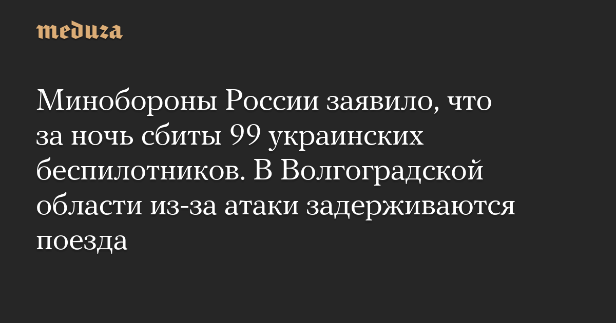 Минобороны России заявило, что за ночь сбиты 99 украинских беспилотников. В Волгоградской области из-за атаки задерживаются поезда