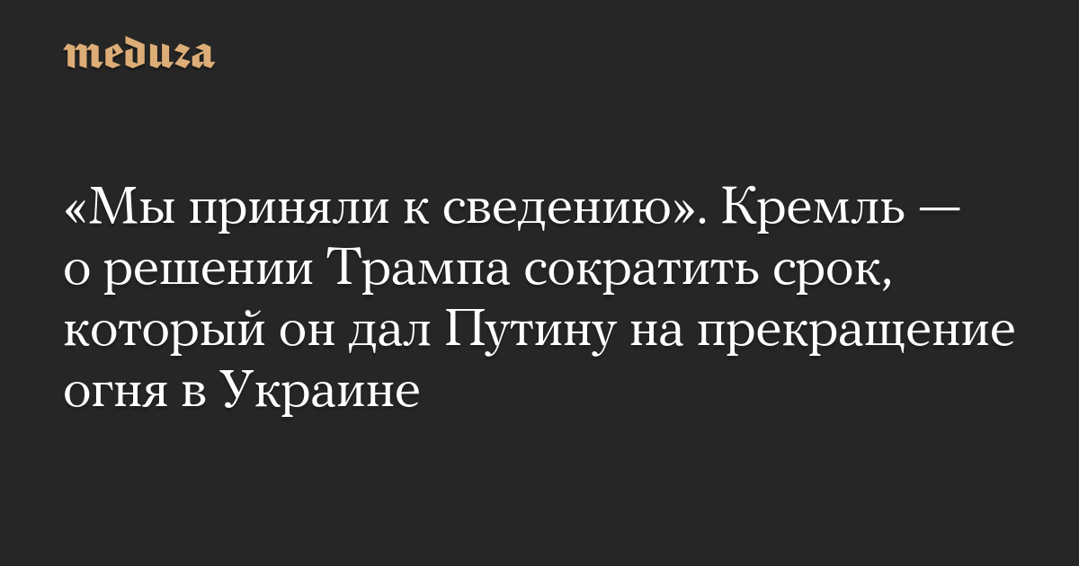В Кремле «приняли к сведению» заявления президента США Дональда Трампа, который объявил, что сокращает установленный для Москвы срок для заключения соглашения о прекращении огня в Украине. Об этом заявил пресс-секретарь президента России Дмитрий Песков.