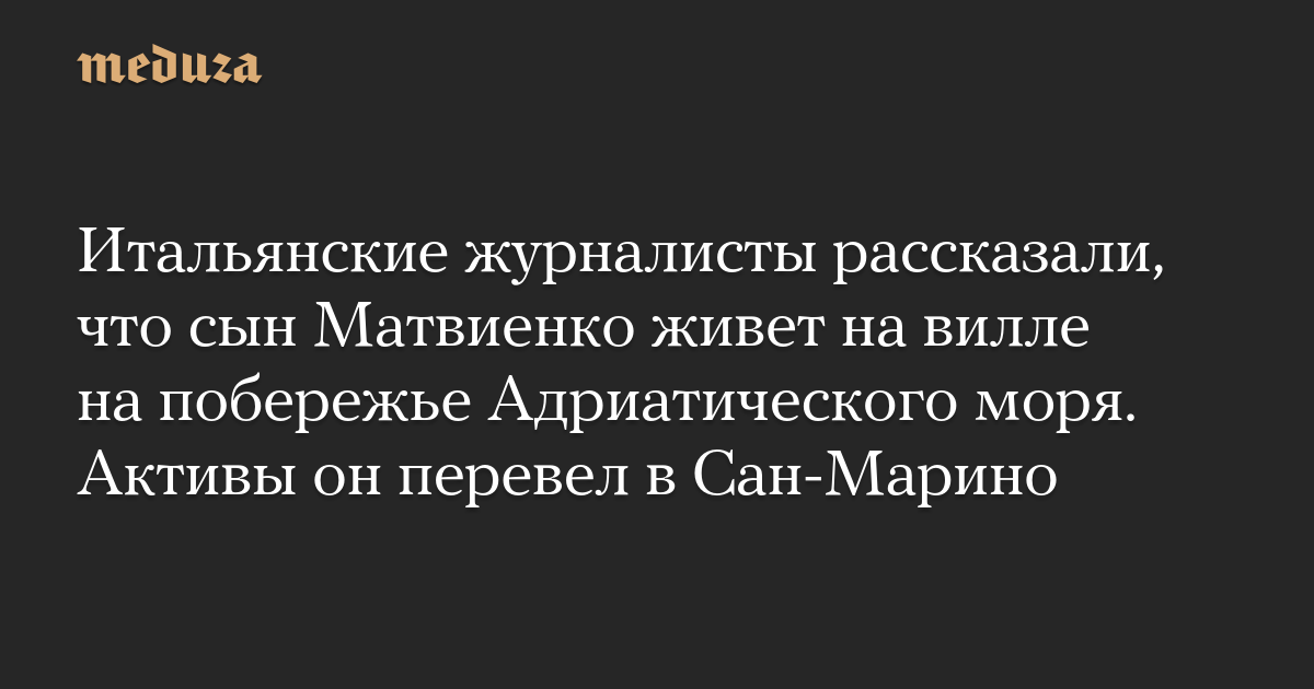 По данным Linkiesta, «вскоре после начала действия санкций ЕС» (о каком именно периоде идет речь, не уточняется, Валентина Матвиенко находится под санкциями Евросоюза еще с 2014 года — прим. «Медузы») Сергей Матвиенко перевел значительную часть семейных активов в Сан-Марино, который стал «новым хранилищем» имущества Матвиенко.