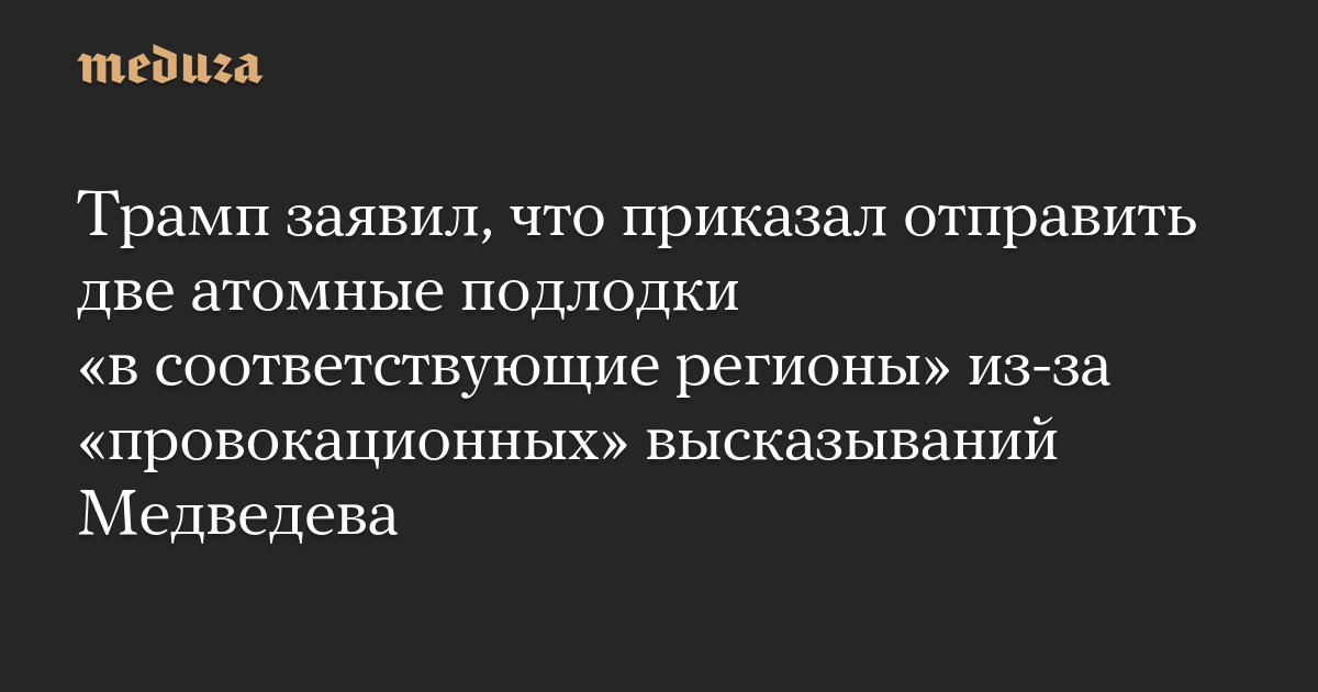 Президент США Дональд Трамп приказал разместить две атомные подводные лодки «в соответствующих регионах» из-за «крайне провокационных» заявлений заместителя председателя Совета безопасности России Дмитрия Медведева.