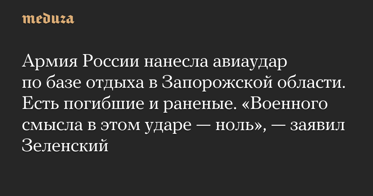Армия России нанесла авиаудар по базе отдыха в Запорожской области. Есть погибшие и раненые. «Военного смысла в этом ударе — ноль», — заявил Зеленский