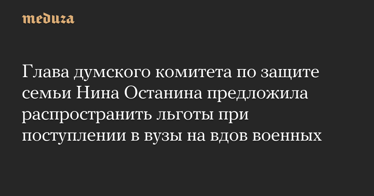 Автор законопроекта — глава комитета Госдумы по защите семьи Нина Останина. В пояснительной записке к документу говорится, что вдовам военных нужно «предложить дополнительные меры поддержки» — возможность получения образования, повышения квалификации и переподготовки.