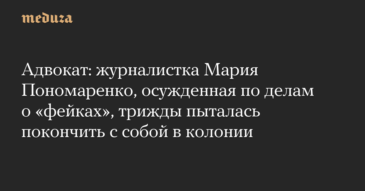 Журналистка RusNews Мария Пономаренко, осужденная по делам о «фейках» о российской армии и нападении на сотрудников колонии, с 30 июля по 9 августа трижды пыталась совершить самоубийство, рассказал ее адвокат Дмитрий Шитов.