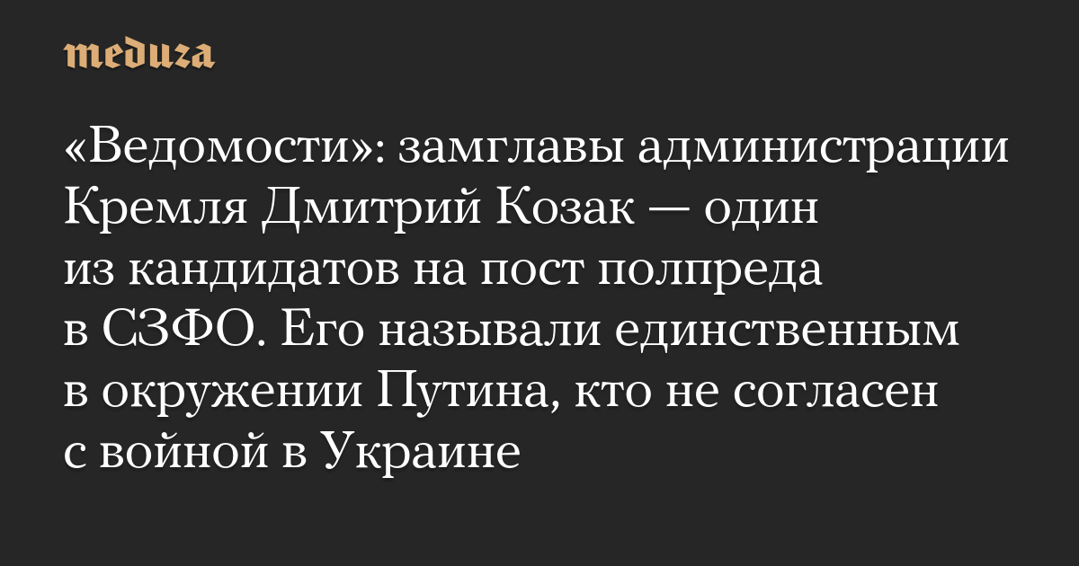 «Ведомости»: замглавы администрации Кремля Дмитрий Козак — один из кандидатов на пост полпреда в СЗФО. Его называли единственным в окружении Путина, кто не согласен с войной в Украине