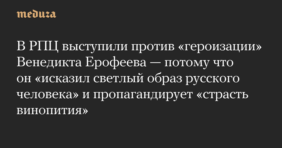 Произведения Ерофеева «искажают светлый образ русского человека, низводя его до убогого состояния», главная характеристика которого — «перманентное алкогольное опьянение», считают в РПЦ. Книги писателя «культивируют уныние, отчаяние и насмешку над институтами общества и государства», а также пропагандируют «страсть винопития», говорится в заявлении.