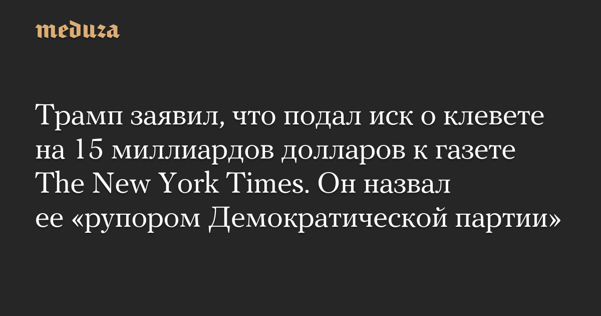 «Сегодня я имею честь подать иск о клевете и диффамации на сумму 15 миллиардов долларов против The New York Times — одной из худших и самых развращенных газет в истории нашей страны, превратившейся фактически в „рупор“ радикальной левой Демократической партии», — написал Трамп.