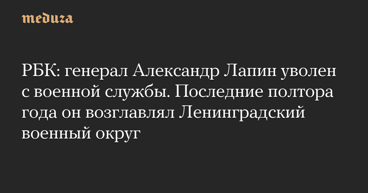 Генерал-полковник Александр Лапин, который с начала войны возглавлял группировку войск «Центр», а затем был переведен в Ленинградский военный округ, уволен с военной службы, сообщает РБК со ссылкой на источник.