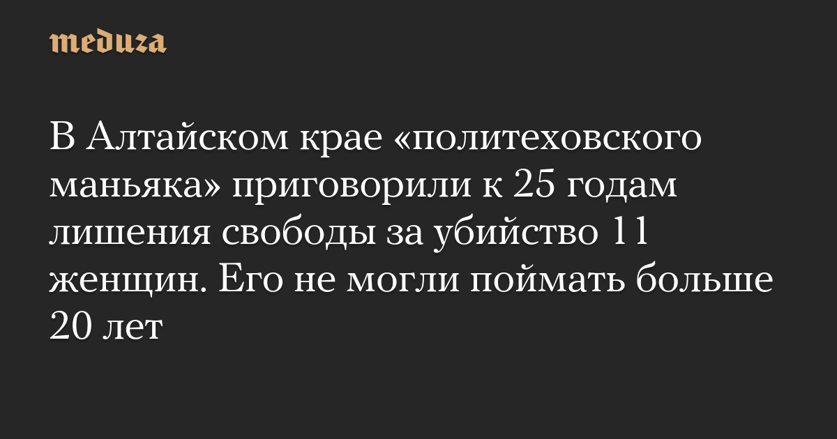 Суд в Алтайском крае приговорил к 25 годам лишения свободы 54-летнего Виталия Манишина, известного как «политеховский маньяк», за убийство 11 женщин.