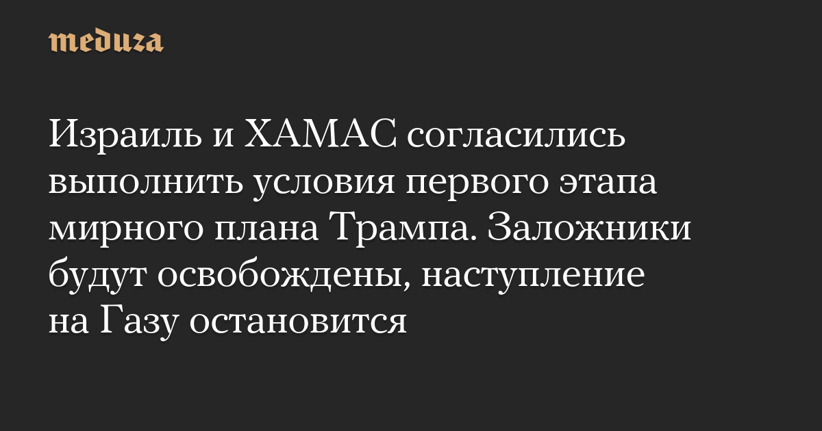 Израиль и ХАМАС согласились выполнить условия первого этапа мирного плана Трампа. Заложники будут освобождены, наступление на Газу остановится