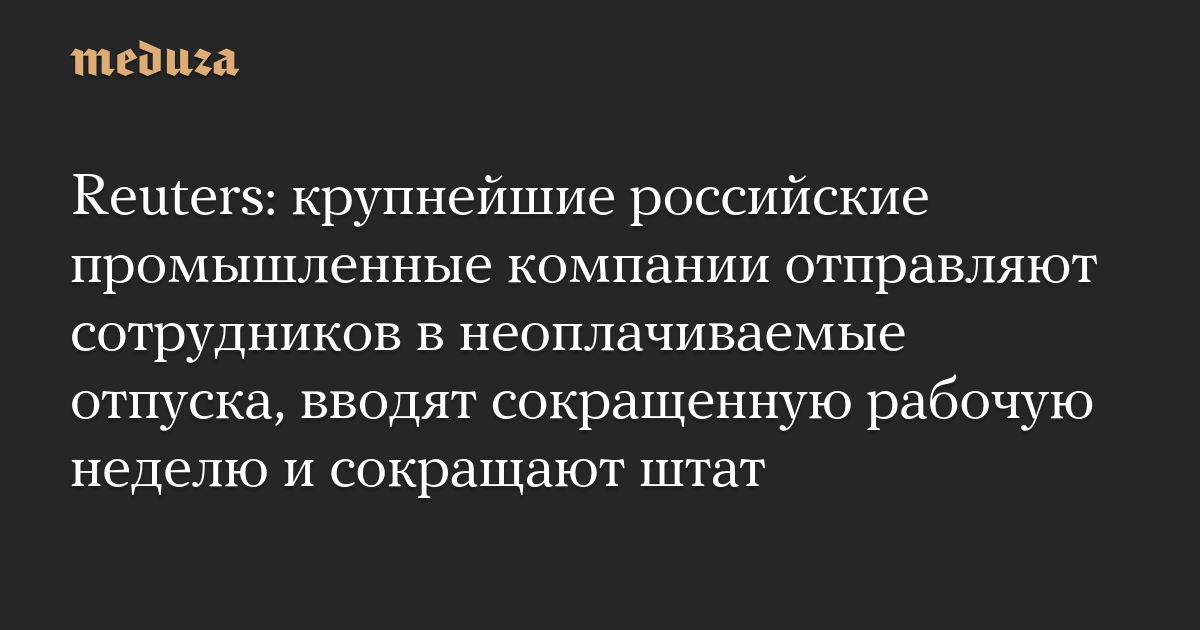 Reuters: крупнейшие российские промышленные компании отправляют сотрудников в неоплачиваемые отпуска, вводят сокращенную рабочую неделю и сокращают штат