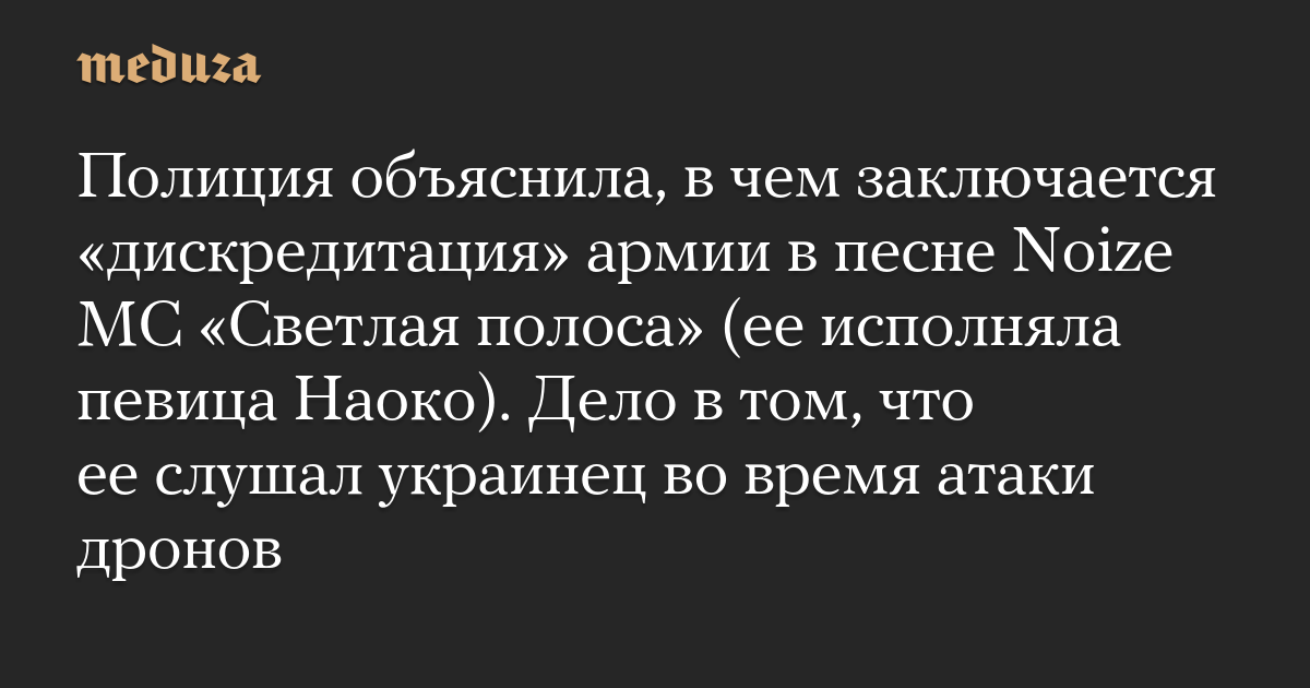 Полиция объяснила, в чем заключается «дискредитация» армии в песне Noize MC «Светлая полоса» (ее исполняла певица Наоко). Дело в том, что ее слушал украинец во время атаки дронов