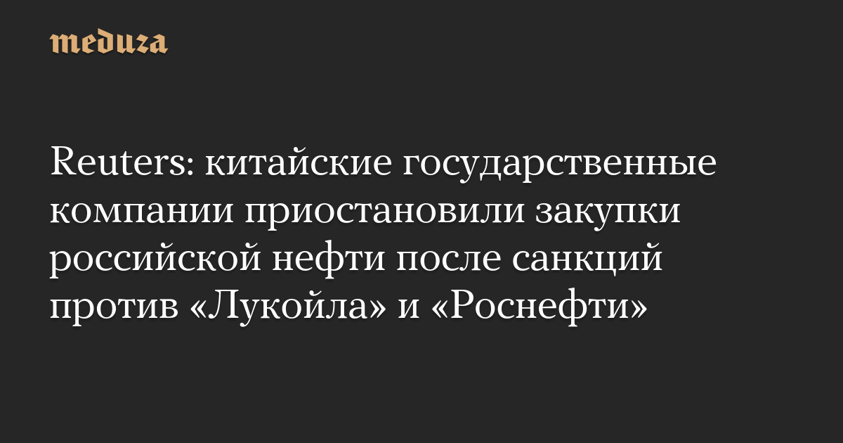 Китайские государственные нефтяные компании приостановили закупки российской нефти после введения санкций против «Роснефти» и «Лукойла», сообщает Reuters со ссылкой на несколько источников в отрасли.