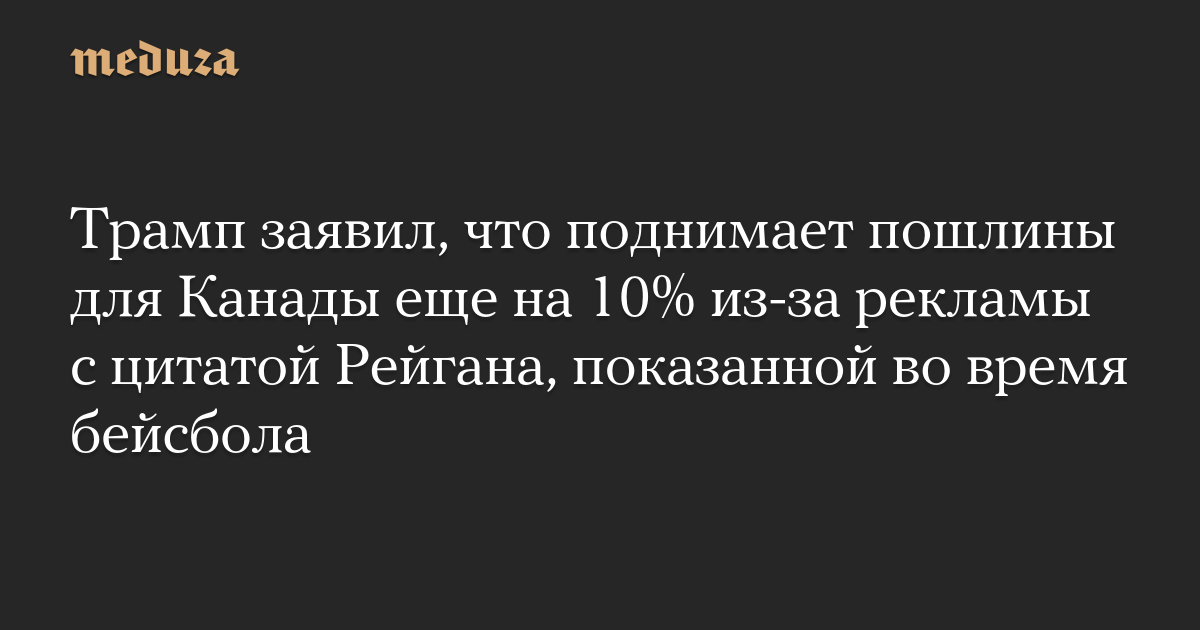 Трамп заявил, что поднимает пошлины для Канады еще на 10% из-за рекламы с цитатой Рейгана, показанной во время бейсбола