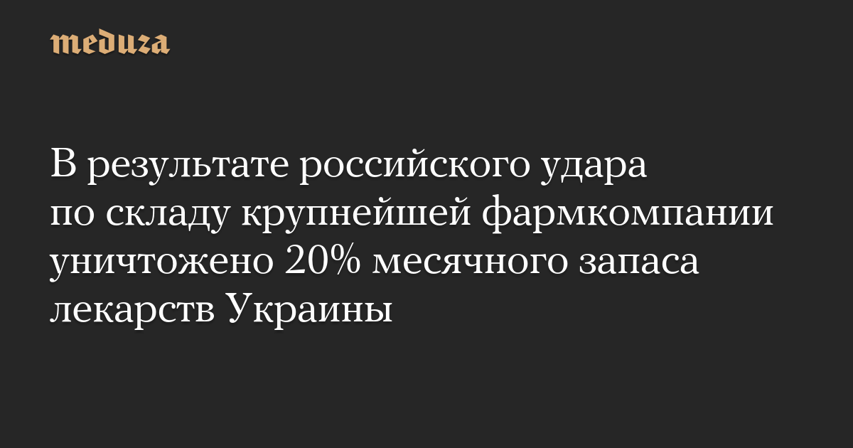В результате российского удара по складу крупнейшей фармкомпании уничтожено 20% месячного запаса лекарств Украины