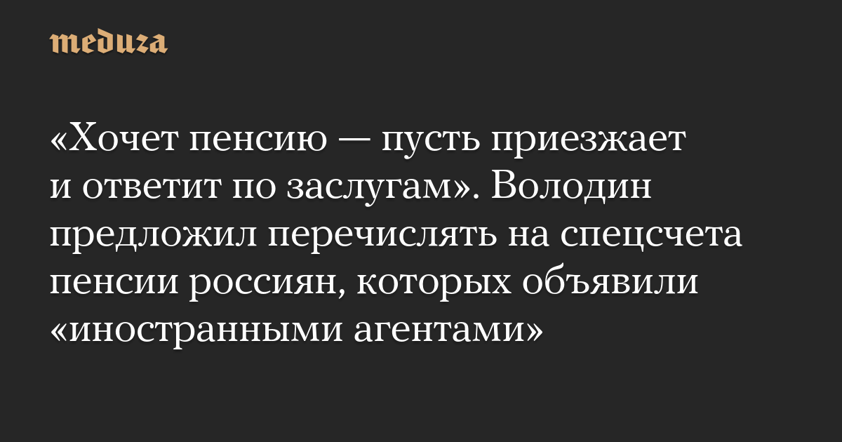 «Хочет пенсию — пусть приезжает и ответит по заслугам». Володин предложил перечислять на спецсчета пенсии россиян, которых объявили «иностранными агентами»