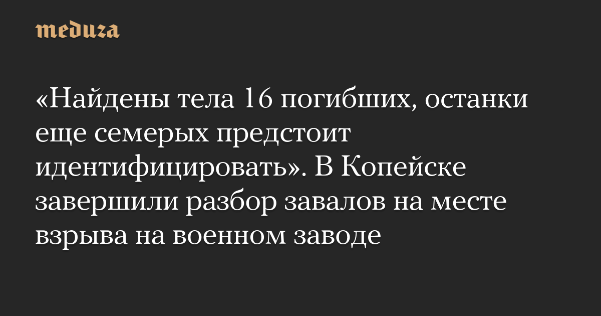 «Аварийно-спасательные работы по ликвидации чрезвычайной ситуации на предприятии в Копейске завершены, — заявили чиновники. — В итоговом списке жертв трагедии 23 человека. Найдены тела 16 погибших, останки еще семерых погибших предстоит идентифицировать. Работа следственных органов продолжается».