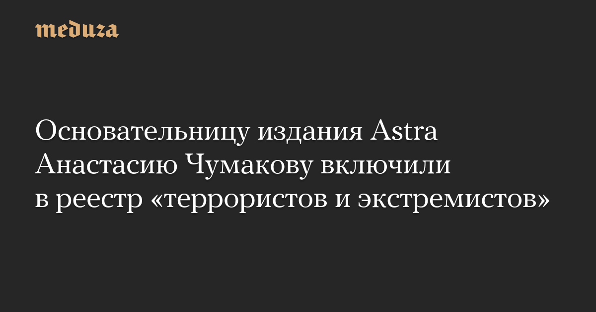 Росфинмониторинг включил в реестр «террористов и экстремистов» 49 человек, в их числе основательница и главный редактор издания Astra Анастасия Чумакова, отмечает телеграм-канал, отслеживающий обновления списка.